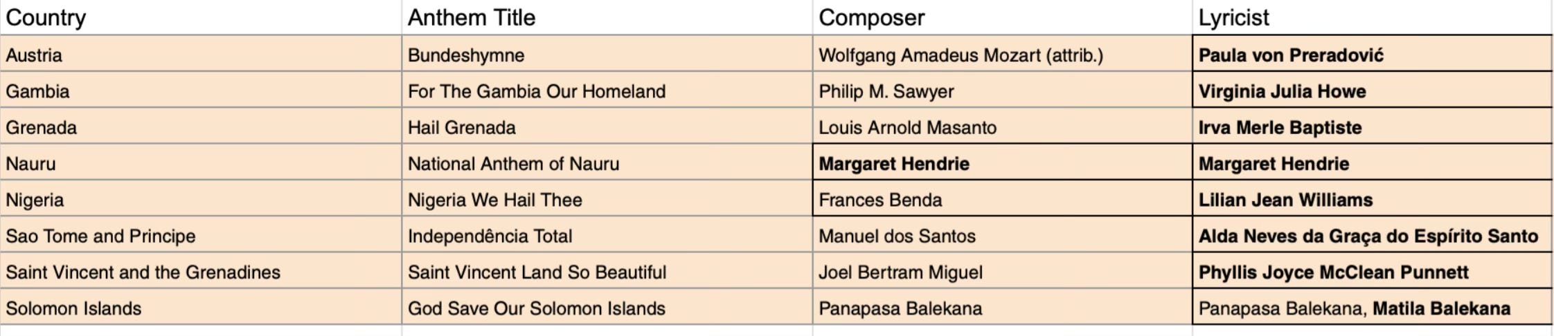 Plus eight official national anthems that credit a woman as composer and/or lyricist